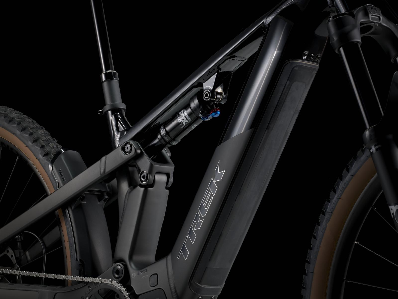 Einen Rahmen aus Alpha Platinum Aluminium mit einem Performance Line CX Antriebssystem von Bosch mit 250 W Leistung und 85 Nm Drehmoment samt abnehmbarem, integriertem PowerTube RIB 2.0 Akku mit massiven 800 Wh Kapazität und Purion 200 Controller. Das Fahrwerkpaket setzt sich aus einer FOX Float AWL Gabel mit 130 mm Federweg, Luftfederung und RAIL 2.0 Dämpfung und einem FOX Float Rhythm Hinterbaudämpfer mit 120 mm Federweg zusammen. Tubeless-Ready-Laufräder mit pannensicheren 2,4"-Reifen, eine Shimano SLX 12-Gang-Schaltung für saubere Gangwechsel, eine Bontrager Line Variosattelstütze und hydraulische Scheibenbremsen.
