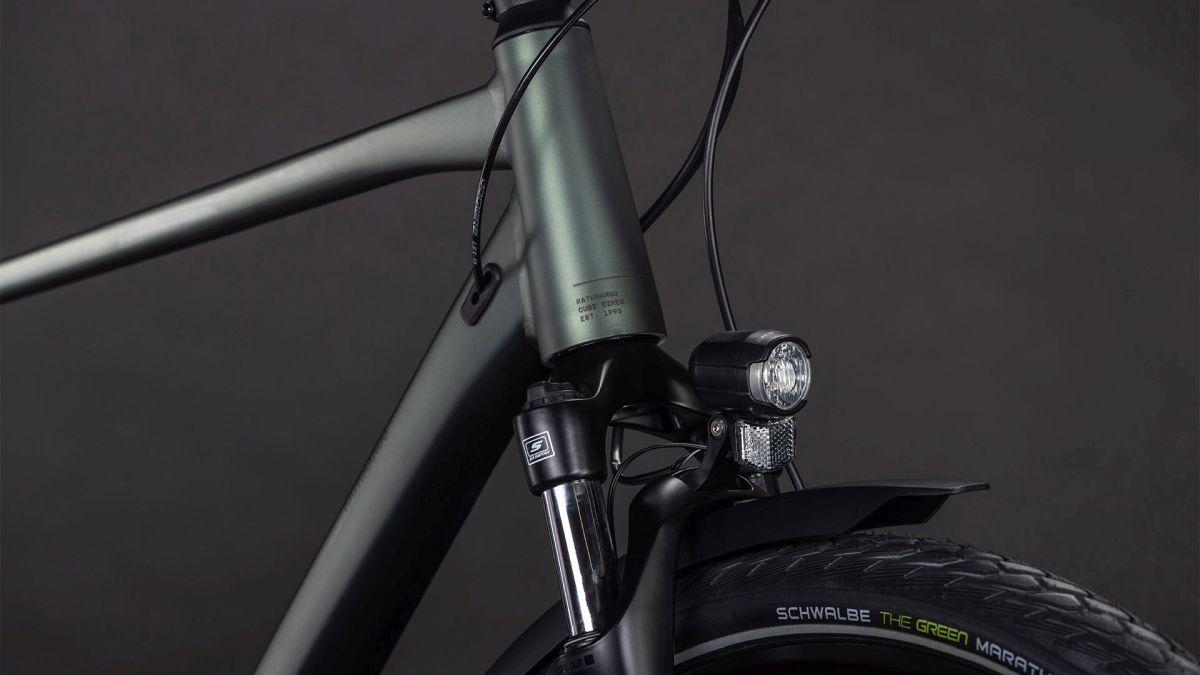 Aufsitzen, antreten und die Tour genießen: Mit dem schlichten Kathmandu ONE von CUBE bekommen Entdecker einen robusten und flexibel anpassbaren Alleskönner unter den Sattel. Auf dem stabilen, vielseitigen integrierten Gepäckträger IC 3.0 findet alles Platz, was unterwegs mit muss. ACID Schutzbleche, Vorder- und Rücklichter und ein Flat Mount Seitenständer sind auch mit dabei. Dazu hat die einfach bedienbare Cues 2x9-fach Schaltung aus dem Hause Shimano in jeder Situation den passenden Gang im Angebot. Ebenso von Shimano kommen die hydraulischen Scheibenbremsen für sicheres Verzögern und Anhalten bei jedem Wetter. Angenehmer Fahrkomfort, auch auf holprigen Wegen, ist das Spezialgebiet der Suntour Federgabel. Umweltbonus: Die spezielle Gummimischung der Green Marathon Reifen von Schwalbe besteht zum Großteil aus recycelten Altreifen – für nachhaltige Mobilität auf allen Wegen. Da kann's doch direkt losgehen, oder?