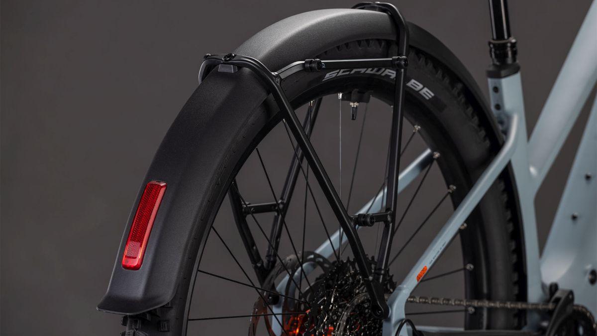 Das Reaction Hybrid Race FE steckt voller praktischer Details. Zum einen ist es standardmäßig mit Schutzblechen, einem robusten Gepäckträger, einem sauber ins Design integrierten Beleuchtungssystem und einem stabilen Seitenständer versehen. Außerdem mit einer versenkbaren Sattelstütze für optimiertes Handling auf steilen Trails. Zum anderen macht die breit gefächerte 12-fach Transmission 90 von Sram selbst anspruchsvolle Routen zum Kinderspiel. Für höchsten Fahrkomfort und 1a-Kontrolle haben wir 2.6 Zoll breite, griffige Schwalbe Pneus und eine einfach einstellbare Rockshox Recon Silver Luftfedergabel mit 120 mm Federweg (100 mm bei den kleinsten Rahmengrößen und den Tiefeinsteiger-Modellen) verbaut. Apropos Kontrolle: Die hydraulischen Louise 4-Kolben-Scheibenbremsen von Magura verzögern das Bike selbst bei Nässe zuverlässig und sicher. Wir haben uns also um alles gekümmert – jetzt heißt's aufsitzen und Spaß haben!