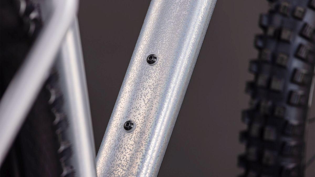 Bergab geht's beim ambitionierten Trail-Riding ja immer irgendwie – aber „irgendwie" ist dem Reaction TM nicht gut genug. Mit 65° Steuerrohrwinkel, 73.5° Sitzrohrwinkel und niedriger Überstandhöhe fährt sich dieser Rahmen auf ruppigen, anspruchsvollen Trails konsequent stabil und zuverlässig. Dank kurzen Kettenstreben befindet sich das Hinterrad direkt unter dem Fahrer, was das Handling präzisiert und die Traktion perfektioniert. Außerdem haben wir genügend Platz für die Montage von Reifen bis 2.6 Zoll gelassen. Dazu kommen standardmäßig im Inneren verlaufende Züge für die versenkbare Sattelstütze und ein UDH Schaltauge für einfache Ersatzteilverfügbarkeit. Ebenso robust gibt sich unser stabiler spritzgegossener Kettenschutz für geräuscharmes Abfahren – und dank der ISCG Kettenführung bleibt die Kette jederzeit auf Spur.