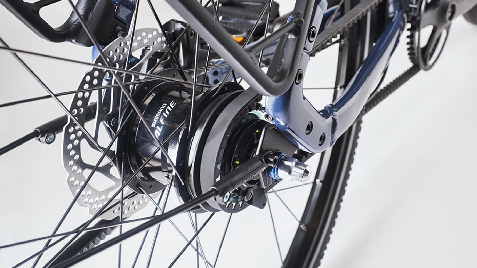 Alfine 11 ist die Schaltnabe von Shimano mit präziser bedienbaren Daumenhebeln statt Drehgriff, die mit einer breiten Übersetzung auch auf Anstiegen und Abfahrten Leistung zeigt.