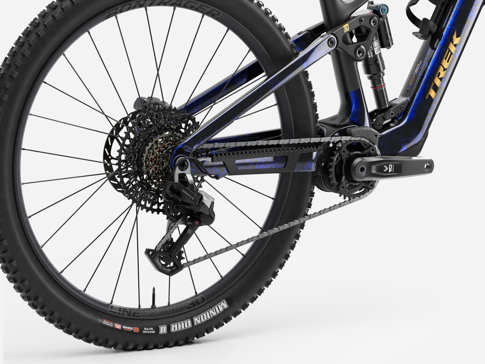 Rahmen: OCLV Mountain Carbon, herausnehmbarer Akku, verstellbarer Steuersatzwinkel, verstellbares Hebelverhältnis, geführte interne Zug- und Leitungsverlegung, austauschbare Aluminiumumlenkhebel, austauschbare untere Dämpferaufnahme, Unterrohrschutz, Shuttle-Protektor, ABP, UDH, Boost148, anpassbarer
