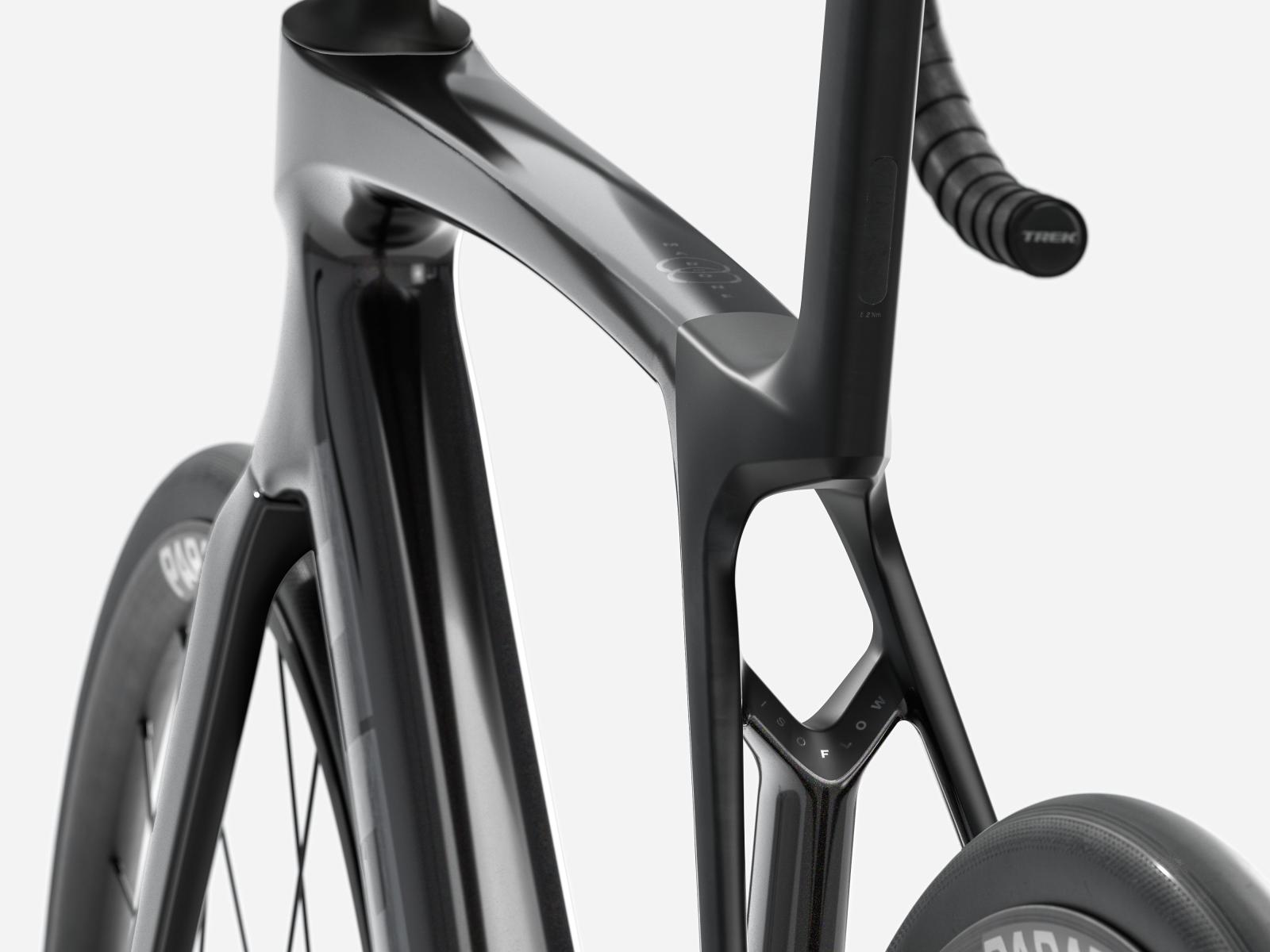 Gabel: Madone Gen 8, Vollcarbon, konischer Carbongabelschaft, interne Bremsleitungsführung, Flat Mount Scheibenbremsaufnahme, abgeschrägte 12 x 100 mm Steckachse
