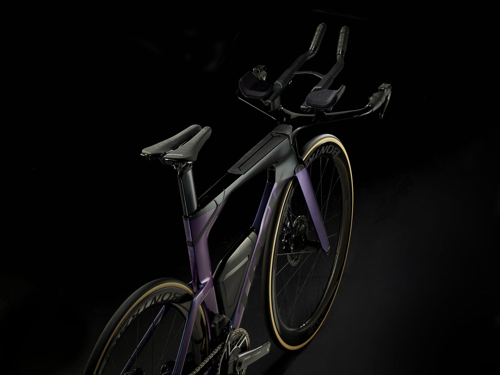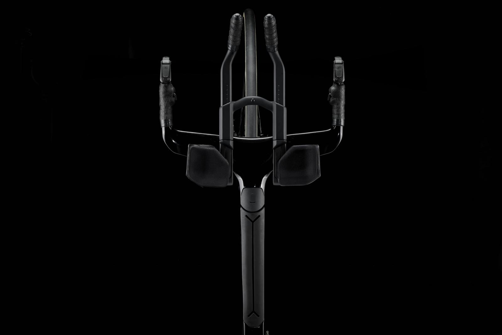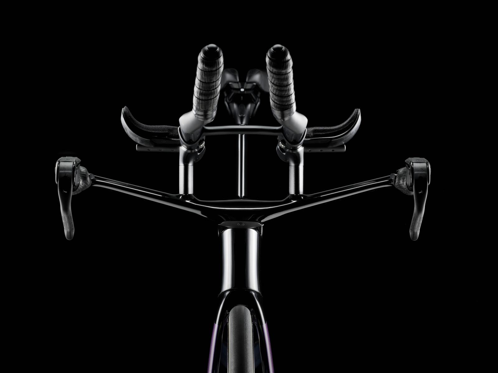 Einen ultraleichten Rahmen aus 800 Series OCLV Carbon samt windschnittigen KVF-Rohrprofilen (Kammtail Virtual Foil), eine Speed Concept Carbongabel mit Aero-Profil, straßenglättendes IsoSpeed und eine integrierte Aufbewahrungslösung für Verpflegung, Flüssigkeit und Pannenkit. Außerdem bekommst du einen elektronischen SRAM RED AXS E1 12fach-Drahtlosantrieb mit Blips-Schalthebeln an den Lenkeraufsätzen und am Basislenker, ein SRAM RED AXS Powermeter, eine integrierte Lenker/Vorbau-Einheit, einen triathlonspezifischen Bontrager Hilo Pro Carbonsattel für eine aggressive Aero-Sitzposition, Scheibenbremsen für zuverlässige Bremsleistu