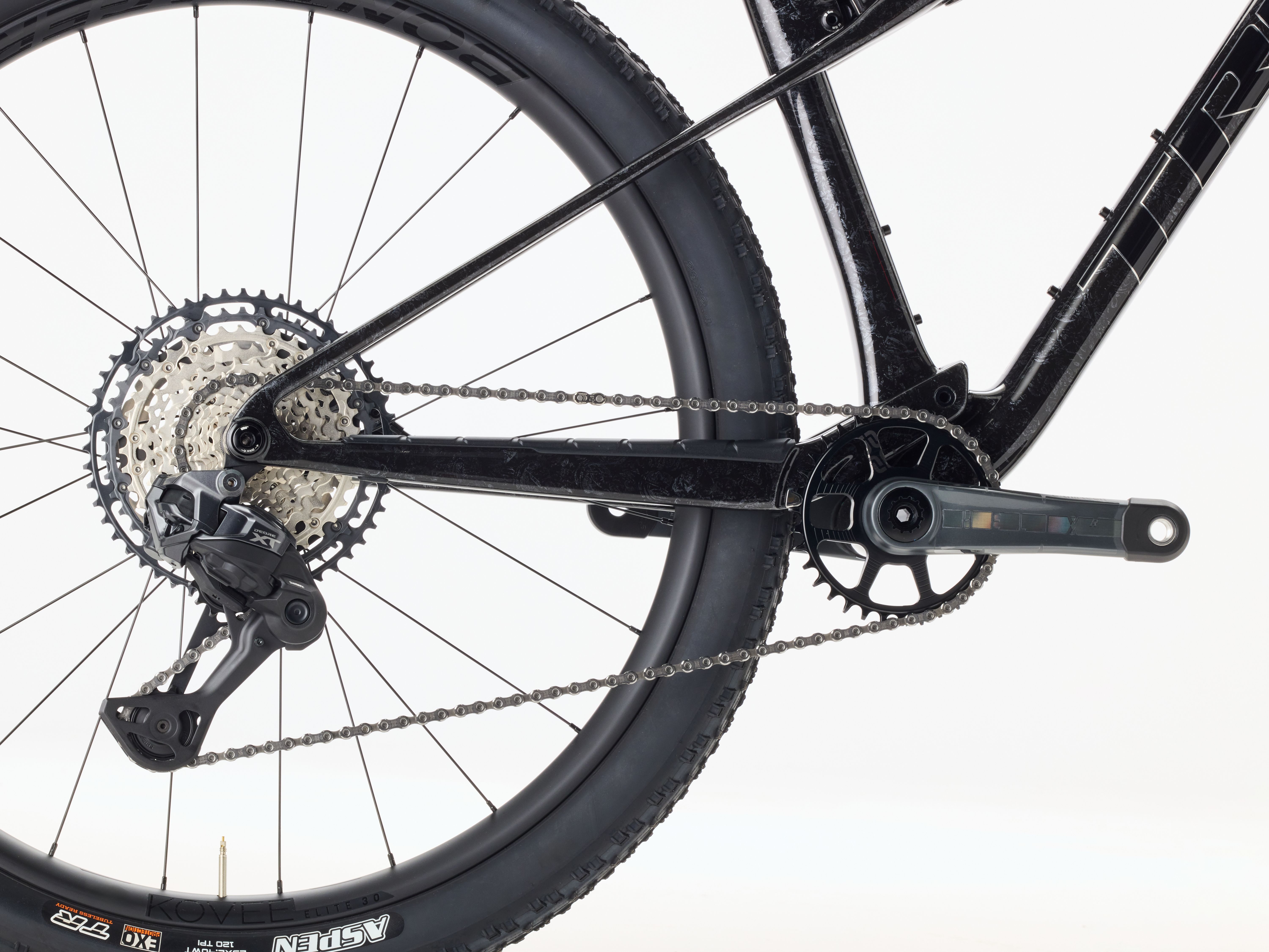 Einen federleichten Rahmen aus hochmoduligem SLR OCLV Mountain Carbon mit moderner XC-Geometrie. Dazu gibts eine FOX Factory 34 SL Step-Cast 110-mm-Federgabel mit Float EVOL Luftfederung, GRIP SL 2-Positionen-Dämpfung und Dual-Remote-Lockout und einen RockShox SIDLuxe IsoStrut-Dämpfer mit 80 mm Federweg. Shimanos brandneuer drahtloser XT Di2 12fach-Antrieb, Bontrager Kovee Elite 30 Carbonlaufräder, eine integrierte Bontrager RSL Lenker/Vorbau-Einheit aus Carbon, eine Bontrager Line Variosattelstütze und hydraulische Shimano XT M8200 Scheibenbremsen runden das Ausstattungspaket ab.