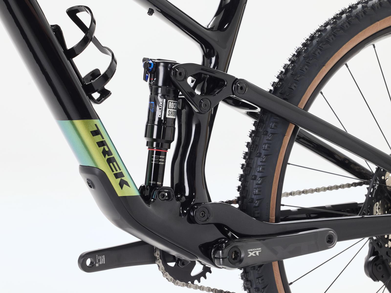 Einen Rahmen aus OCLV Mountain Carbon mit vierfach verstellbarem Mino Link an der unteren Dämpferaufnahme zur Feinanpassung der Rahmengeometrie und des Hebelverhältnisses des Fahrwerks. Eine RockShox Pike Select+ Gabel mit 130 mm Federweg, DebonAir Luftfeder und Charger 3.1 RC2 Dämpfung sowie einen RockShox Deluxe Ultimate RCT Hinterbaudämpfer mit 120 mm Federweg. Shimanos brandneue drahtlose XT Di2 12-Gang-Schaltung, hydraulische Shimano XT 4-Kolben-Scheibenbremsen, eine Bontrager Line Variosattelstütze und Bontrager Line Comp 30 Tubeless-Ready-Laufräder runden das hochwertige Ausstattungspaket ab.
